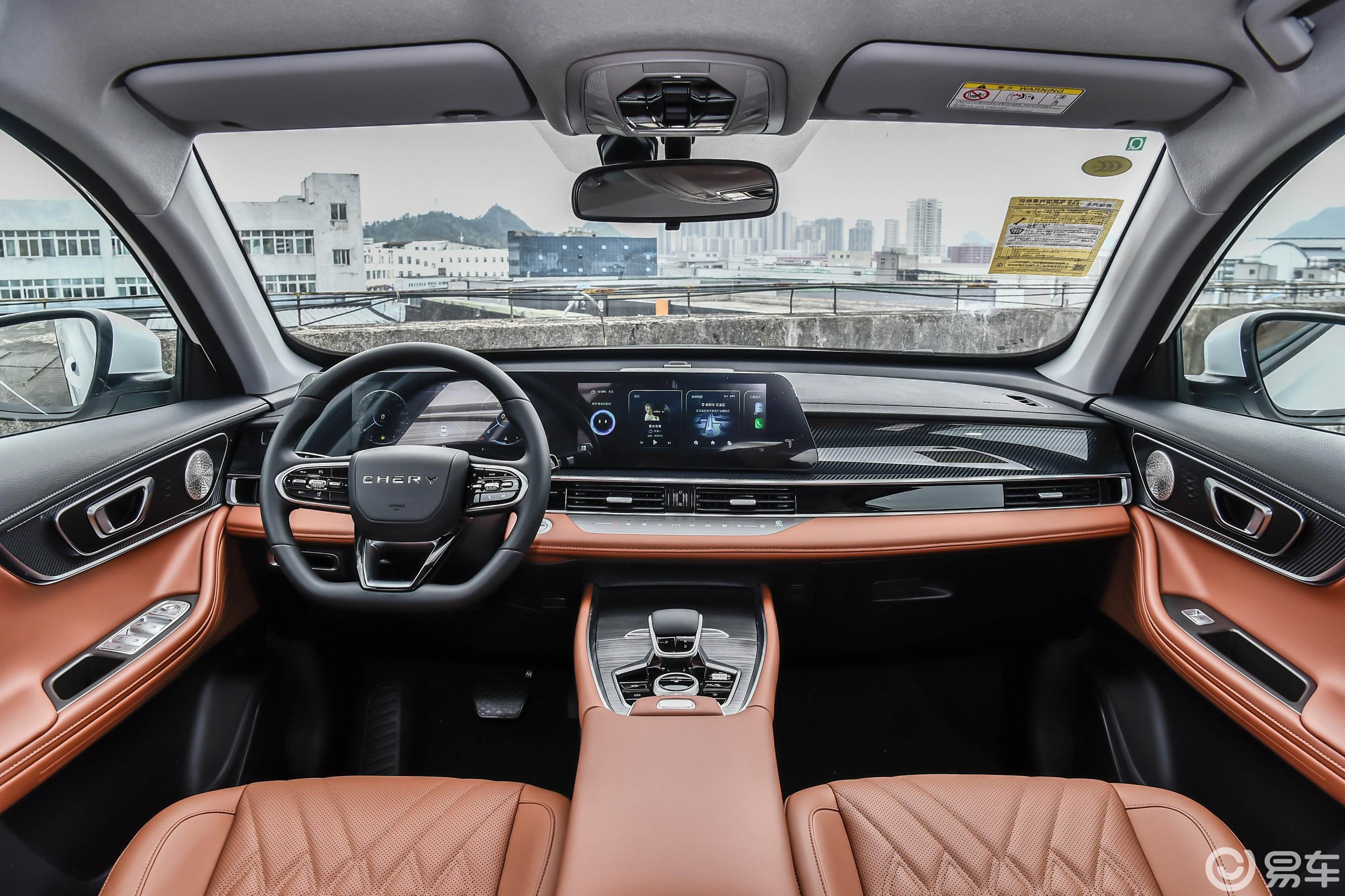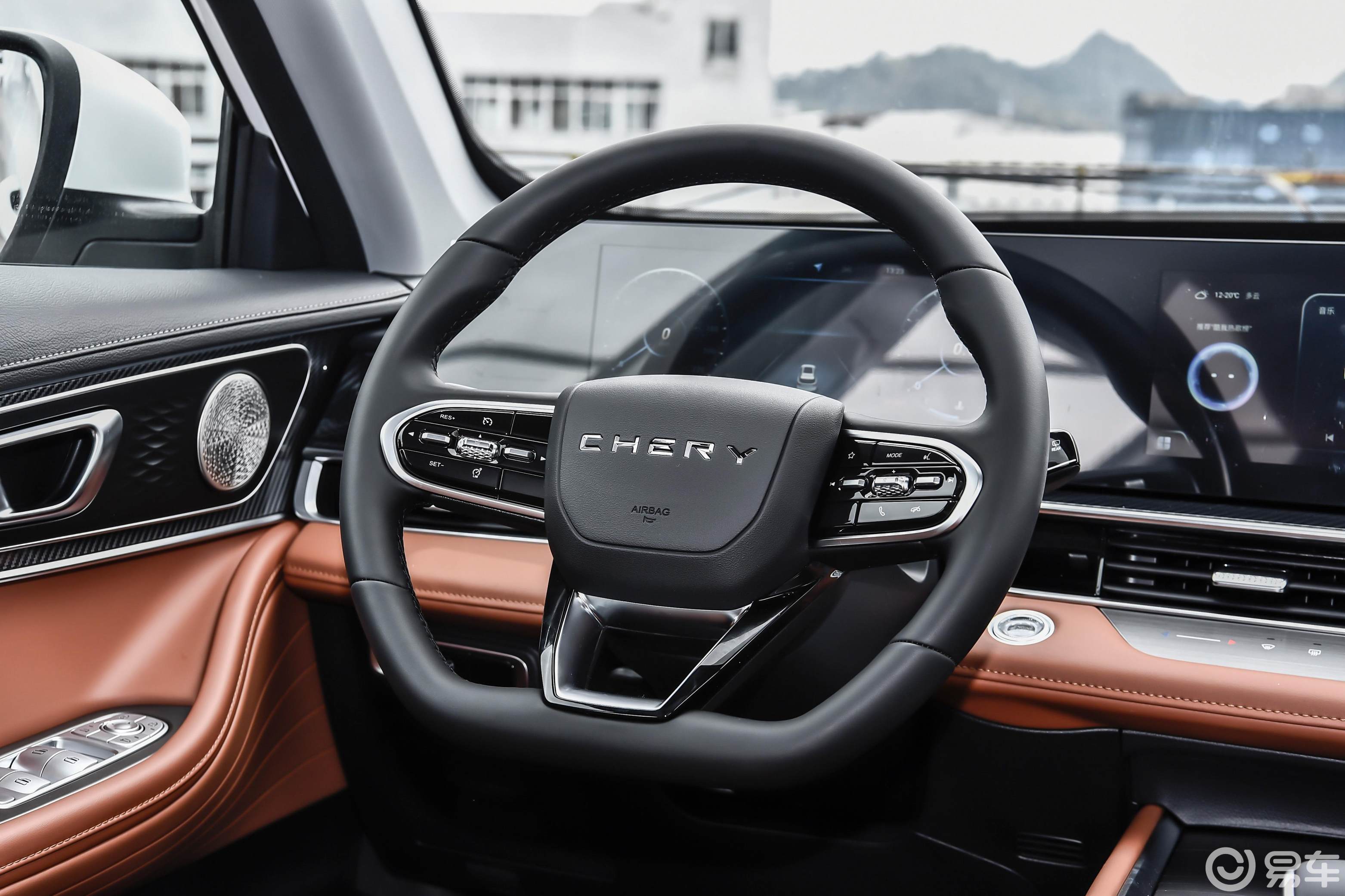 内饰,全新瑞虎7方向盘样式有变化,换装CHERY的标识方向盘,具有方向盘加热功能,引入全新的24.6英寸曲面沉浸环绕屏,搭配Lion雄狮智云系统。