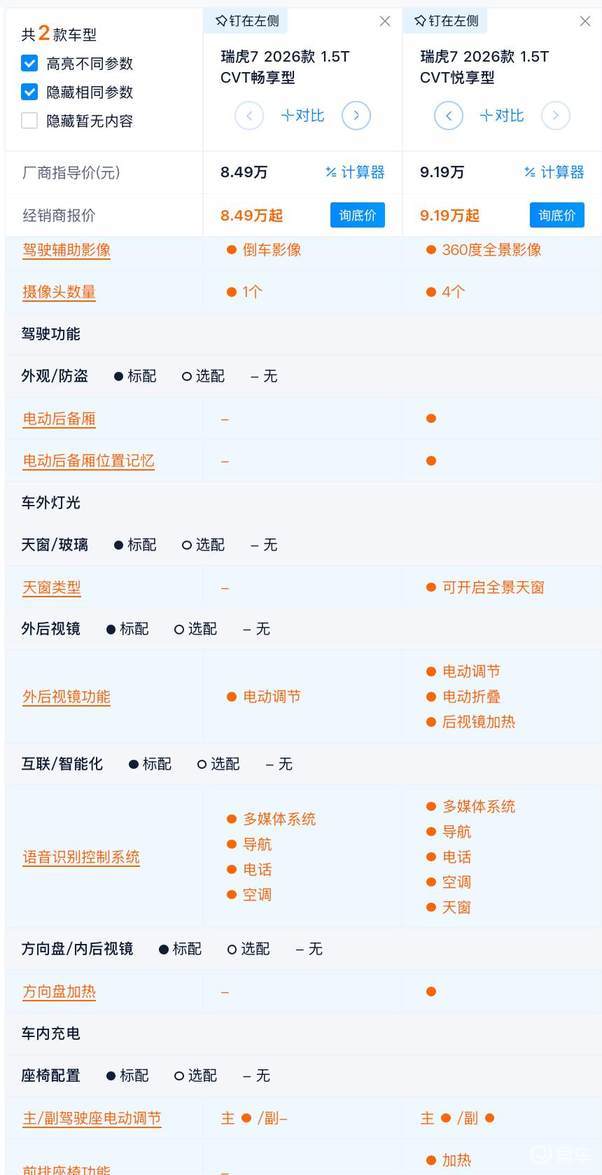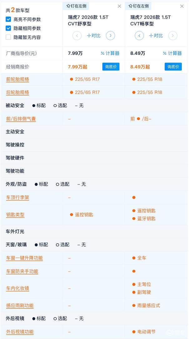 车型矩阵来看,2026款瑞虎7一共3款,起售价7.99万,顶配价格9.19万元。
